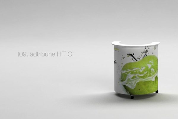 Promo pult HIT C je moderan, kompaktan i izdržljiv reklamni alat za različite promocije. Stabilna i složljiva konstrukcija je upotrebna za prijenos, jednostavno postavljiva sa nosivosti do 100 kg. Namještena kola omogućavaju priručno kretanje, tisak je uključen. Moderan i upadljiv C oblik je garancija, da ćete se na promociji istinski isticati.