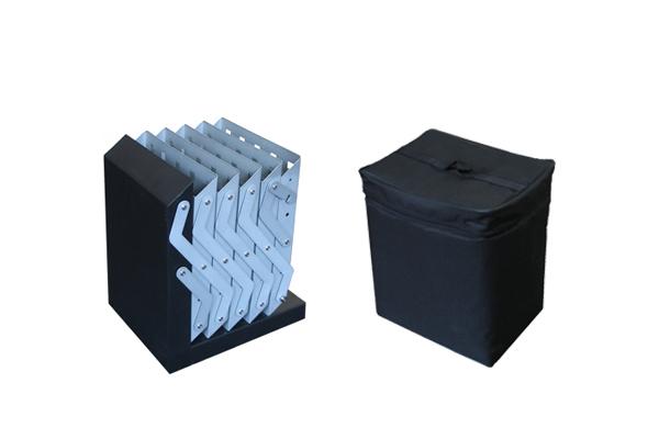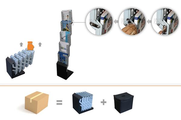 Stalak se jednostavno raširi, u njega možete namjestiti letke, prospekte ili druge reklamne materijale. Konstrukcija je pakirana u priručnu prijenosnu torbu.