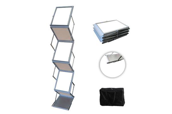 Aluminijasti reklamni stalak za prospekte Z konstrukcije je brzo sastavljiv, prenosljiv i koristan alat za sve vrste promocija. Pakiran u prijenosnu torbu je jednostavan za prijenos, sastavi se u par sekundi.