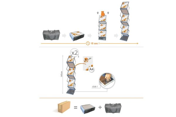 Stalak se jednostavno raširi, u njega možete namjestiti letke, prospekte ili druge reklamne materijale. Konstrukcija je pakirana u priručnu prijenosnu torbu.