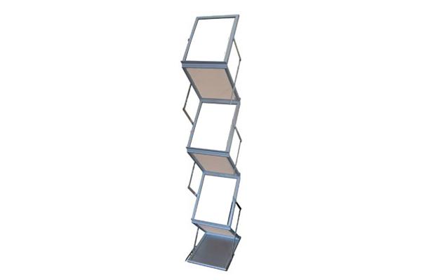 Aluminijasti reklamni stalak za prospekte Z konstrukcije odlikuje jednostavnost sastavljanja, prenosljivost i višenamjena. U njega možete pohraniti prospekte do veličine A4. Šire ladice pružaju raspored većeg broja reklamnog materijala.